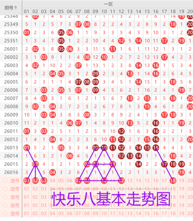 我们先来看下一区的基本走势情况,上期开出了两枚开奖号码,从高位直落谷底,本期继续看一区走冷,预计在3-4枚开奖号码,首先我们来看04的落位,上方空一01 02的落位,本期01 02 03的回补点位建议三选一。三角叉的四码07 08 10 12建议四选一。18的斜三连。