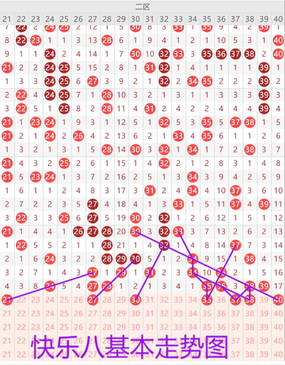 我们来看下二区的基本走势情况,上期开出了七枚开奖号码,本期预测开出5-6枚开奖号码,首先我们来看21的同路斜三连走势及形态。27的四斜连延续走势三重。30的三斜连。35 36 38 39假五连开出重号双通路建议一路选一个。37的夹子号,重点关注冷号40的开出。