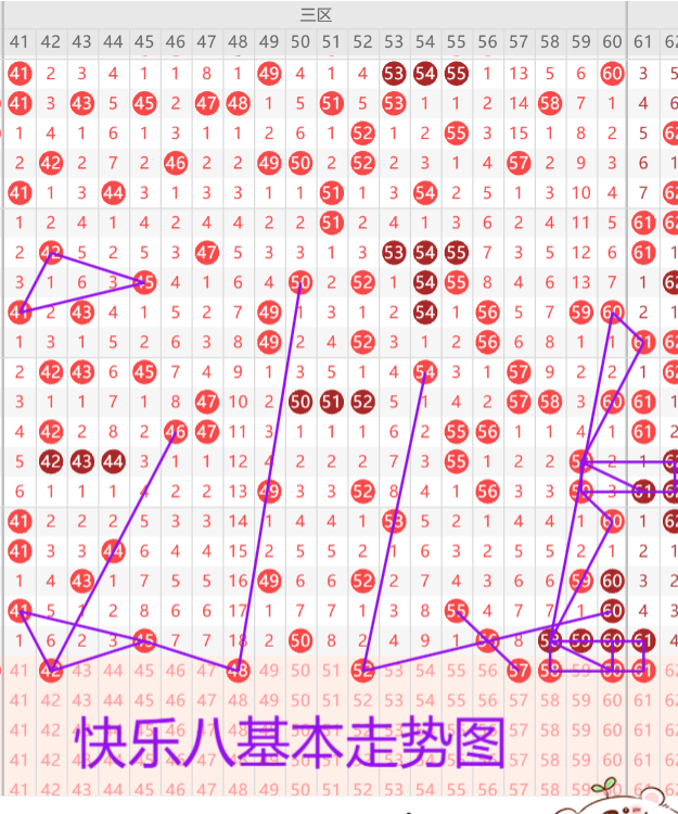 我们来看下三区的基本走势情况,上期开出了六枚开奖号码,本期预测开出3-4枚开奖号码,首先我们看如图所示中的42偶数三斜连并且有同形态。防守冷号48的三斜连开出。45孤码开出的同路42 48做二选一。52的双线斜三连。57的三斜连,58 60的重号复制如图所示中的59 61形态做号,建议二选一。