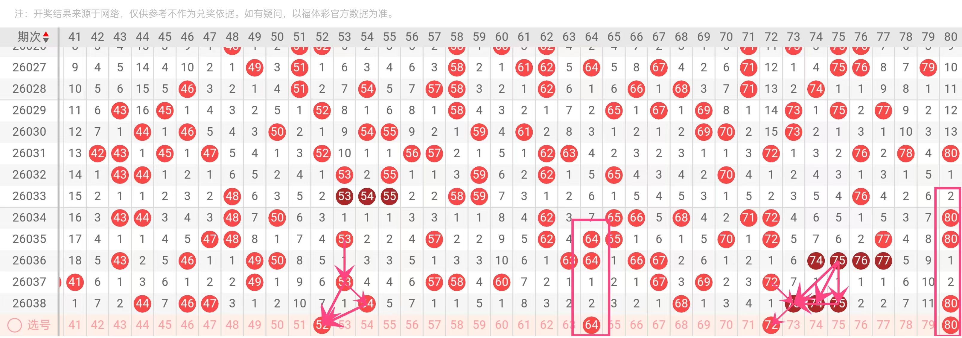 胆码80:近5期出现3次(2026034、2026035、2026038期),最近一期开出显示强势。80作为最大号码,常作为收官号,在热态下易连开,且大号区近期集中出号,80有望巩固此格局。