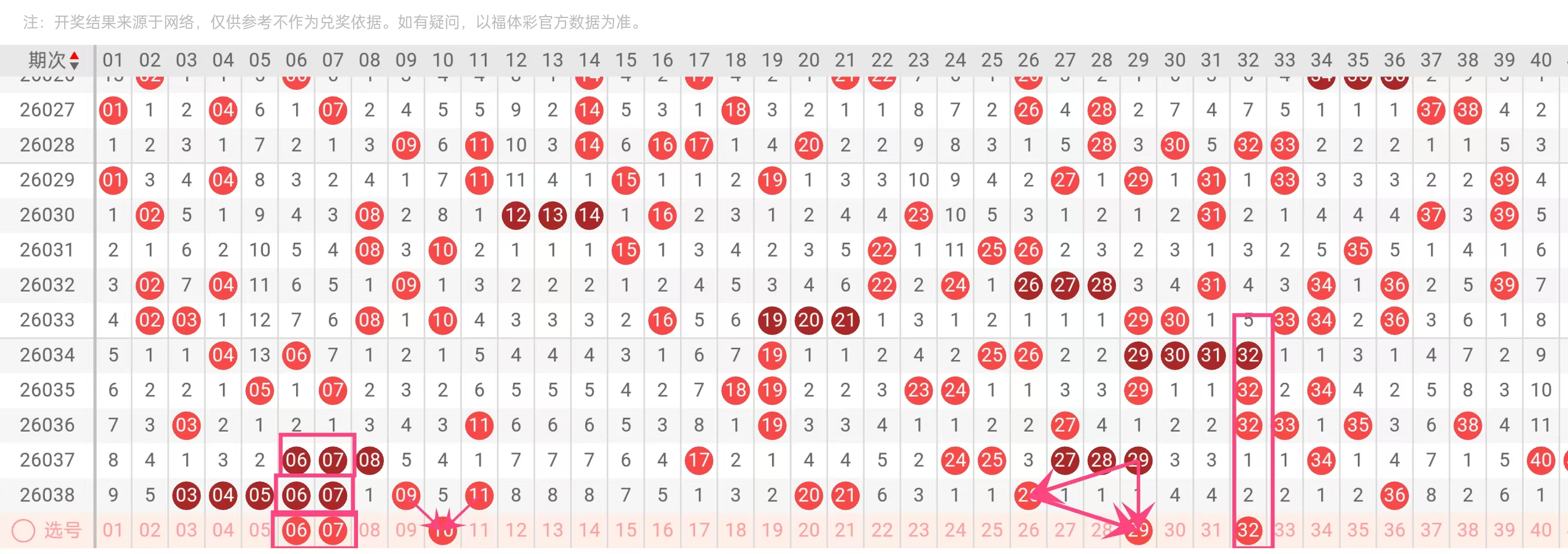 胆码32:近5期出现3次(2026034、2026035、2026036期),但2026038期遗漏。热号短暂缺席后易快速回补,32与29、34常联动,且位于30-35活跃区间,遗漏补偿机制下反弹潜力大。