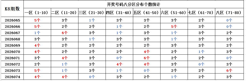 首先看上期回顾,“快乐8”第26074期开奖结果:2.5.7.8.11.13.15.16.20.31.32.33.41.43.52.62.70.71.72.73;通过分析开奖号码,分享第一个数据分析:统计开奖号码的八分区冷热走势,判断出号规律。以近10期开奖号码的八分区统计数据为例: