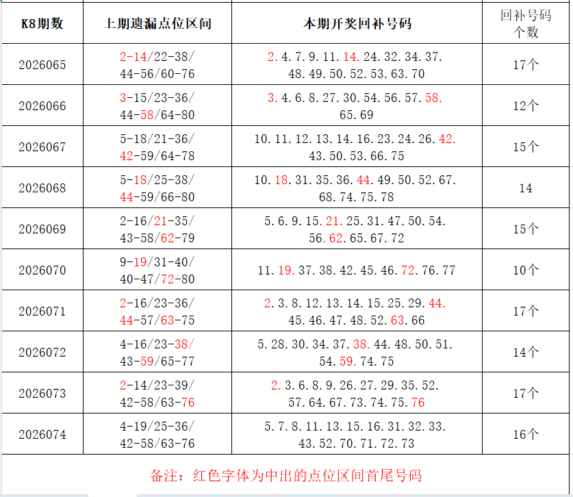 如图,上期的遗漏号码在下期开出10个左右,即为回补号码。定准点位区间首尾号码是关键!以上期2026074期为例,定位4个遗漏区间,围中16码!结合上期开奖号码,以跨度值大于或等于7为依据,本期关注5个遗漏区间:20-31/33-41/43-52/52-62/62-70;重点关注遗漏区间:4-16/21-35/42-56/64-75。点位区间号码和大底号码请勿混淆,个人分析,仅供参考。