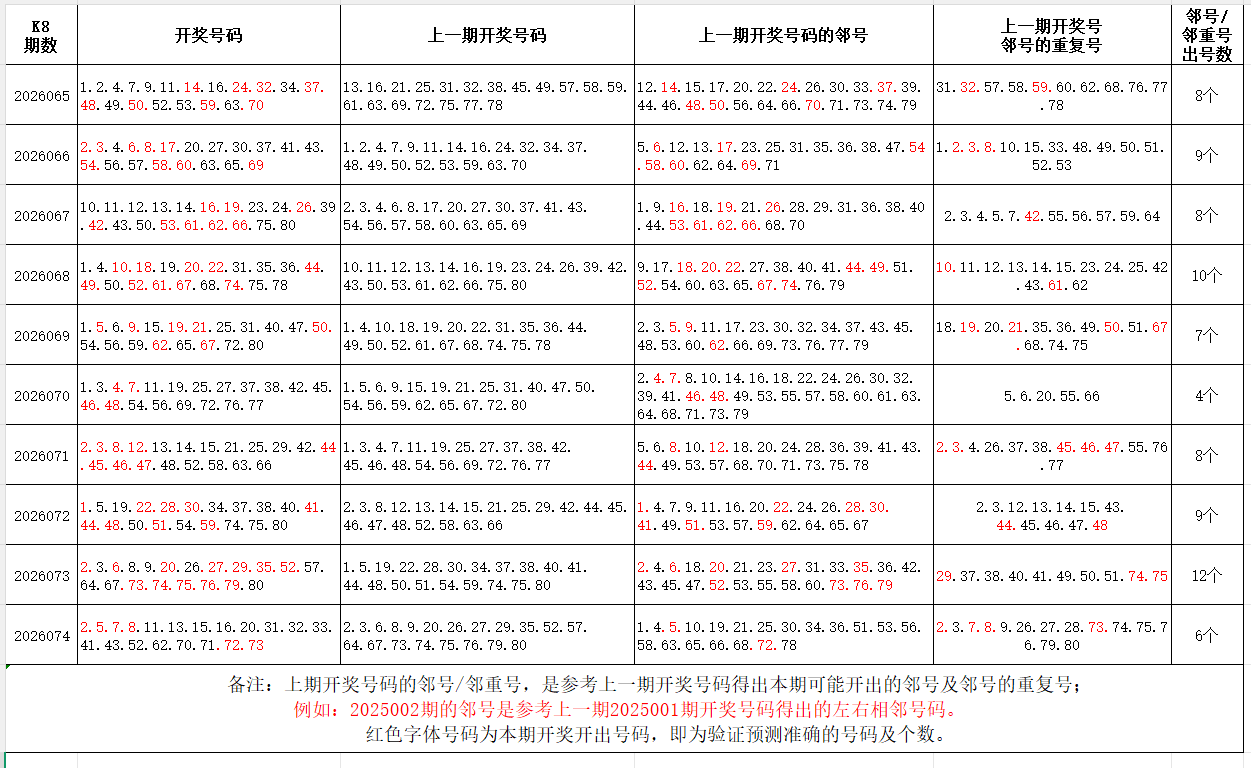 如图,红色字体是上期邻号、邻重号在下期开出,每期开出10个左右。上期邻号开出2个,邻重号开出4个。本期参考邻号:1.3.4.9.10.17.19.21.30.34.40.44.51.53.61.63.69.74;邻重号:6.7.8.12.14.15.16.31.32.33.42.70.71.72.73;个人分析,仅供参考。