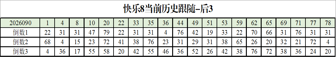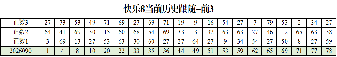 我感觉选热的同时,还要注意防冷条件开出,可以直接选取每个号码跟随出次前三的号码,也可以考虑把出次最后的三个数字加进去,不过这样可能号码太多,可以尝试。图上也能看出单独号码跟随的情况,我就不一一统计每个号码的出次了,我这里考虑提高概率,取每个号码历史跟随的前三号码和后三号码,根据2026090期的号码,我关注正数3和倒数3的号码号码为: