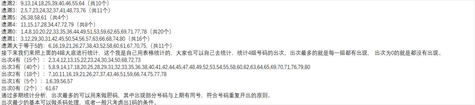 如果把对数和补数合起来有40个号码,中间可能还会产生一下重复数,通过近几期的统计分析,以上期数据进行补数对数计算推算下一期的概率不高。为提高概率,我主要是用前两期的数据来进行对数补数推算,然后再组成一个集合,作为我的第四组大底号码。