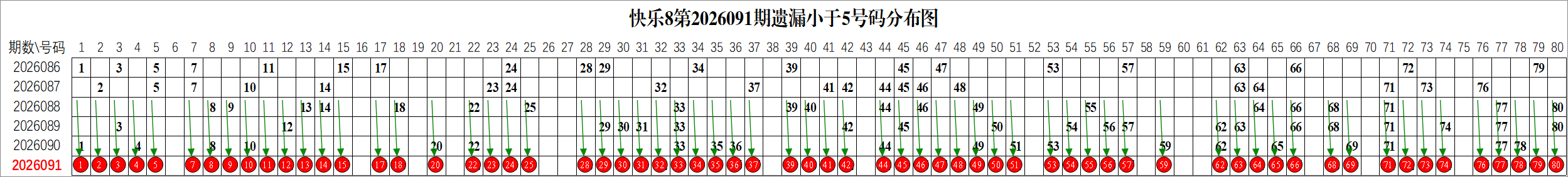 所以这个条件值得关注,从号码分布图上我们可以分析出,遗漏小于5期的号码有:
