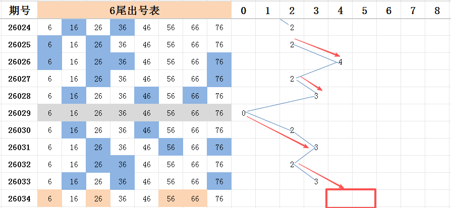 本期看好开出的范围是两码走势至四码走势之间。六尾上期开出三码走势,本期六尾比较不错的号码中,号码06是三斜连的号码走势,比较不错。号码26是上期开出号码16和36的夹码,也是比较不错的号码,号码56和号码66可以考虑能开出其中一码。