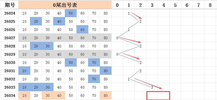 本期看好开出的范围是两码走势至四码走势之间。0尾上期开出三码走势,位于一区二区三区的号码10.20.30全部开出了。本期如果还能够开出三码走势,那么考虑号码30和号码40能开出其中一码。尾码可以考虑号码80的开出。