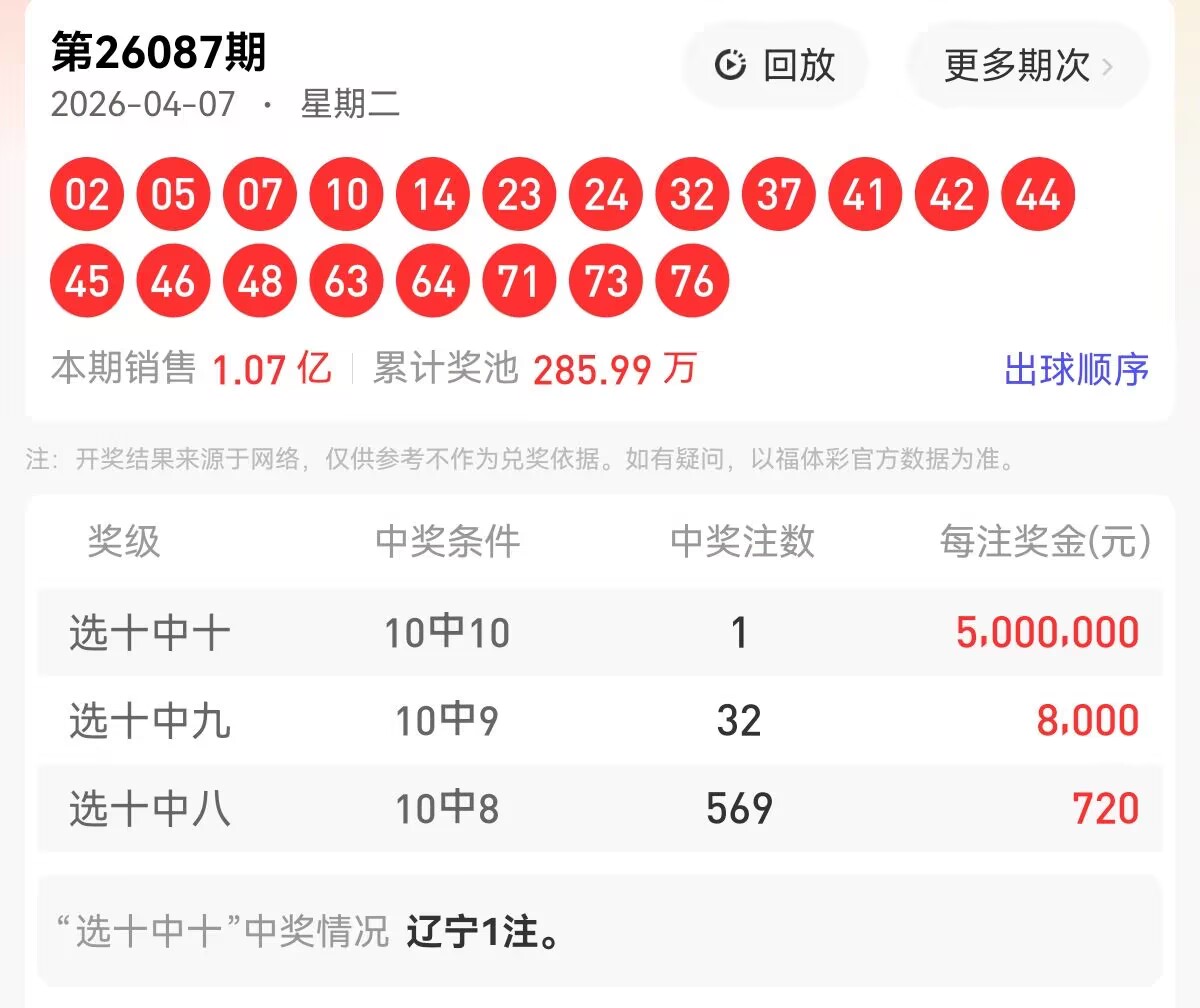 上期福彩快乐8第 2026087期开奖号码为【02 05 07 10 14 23 24 32 37 41 42 44 45 46 48 63 67 71 73 76】,其中大小比11:9,奇偶比为9:11,和值为767,跨度74,四区间比为5:4:6:5。下面是对本期对于每个号码的详细分析。