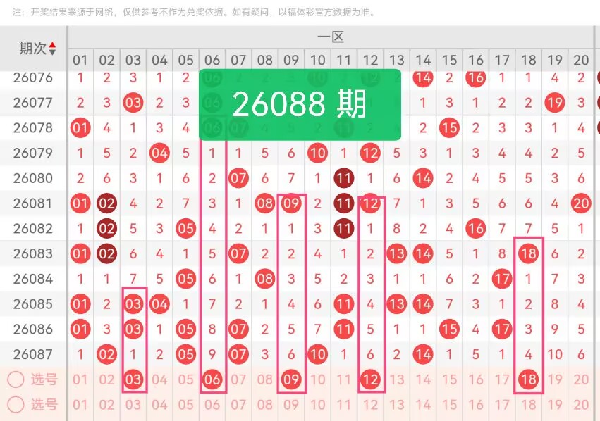 上期第一区间开奖5个号码,本期可能会稳定开出。03作为上期开出02、05的邻号,处于区间前端,近期活跃度回升,是衔接小号区的关键号码。06属于区间内温号,奇偶均衡,与周边05、07形成间隔补位,符合近期隔期出号规律。09为区间中段偶数,近几期未频繁开出,处于温和回补状态,与12形成奇偶搭配,平衡区间比例。12是区间内稳定温号,历史出现频次均衡,常作为区间过渡号码,衔接前后段号码分布。18为区间后端大号,近期偶有开出,与14形成间隔补号,维持区间热度。