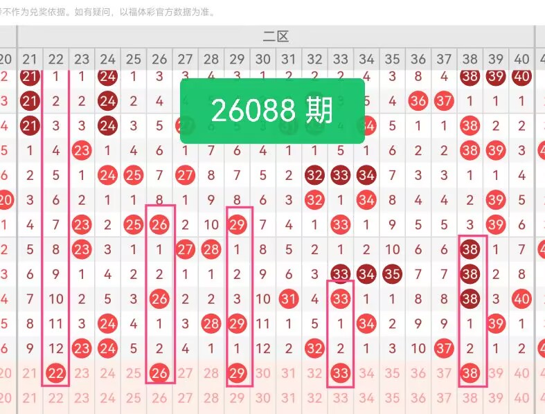 上期第二区间开奖4个号码,本期可能会增加开出。22作为23、24的邻号,处于区间前端,上期开出23、24后,是衔接前区的优选。26属于区间中段偶数,历史走势稳定,近几期处于温和遗漏状态,符合均衡出号规律。29为区间奇数,与26形成奇偶搭配,处于26-33之间的过渡位置,填补中段空白,近期活跃度稳定。33是32的邻号,上期开出32,邻号回补趋势明显,且33为区间热区号码,历史出现频次较高。38处于区间后端,与37形成邻号关系,上期开出37后,后端补号需求增加,38作为温号,衔接区间后端与三区。
