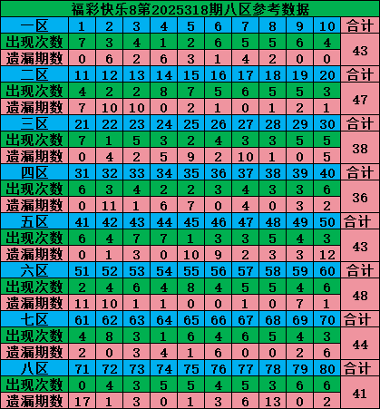 最后再把号码分为四区:一区01-20号、二区21-40号、三区41-60号、四区61-80号,理论上每个区每期应该开出5个号码: