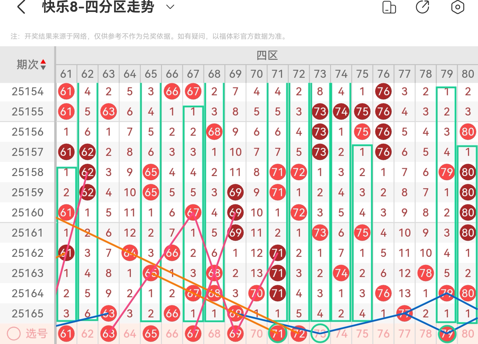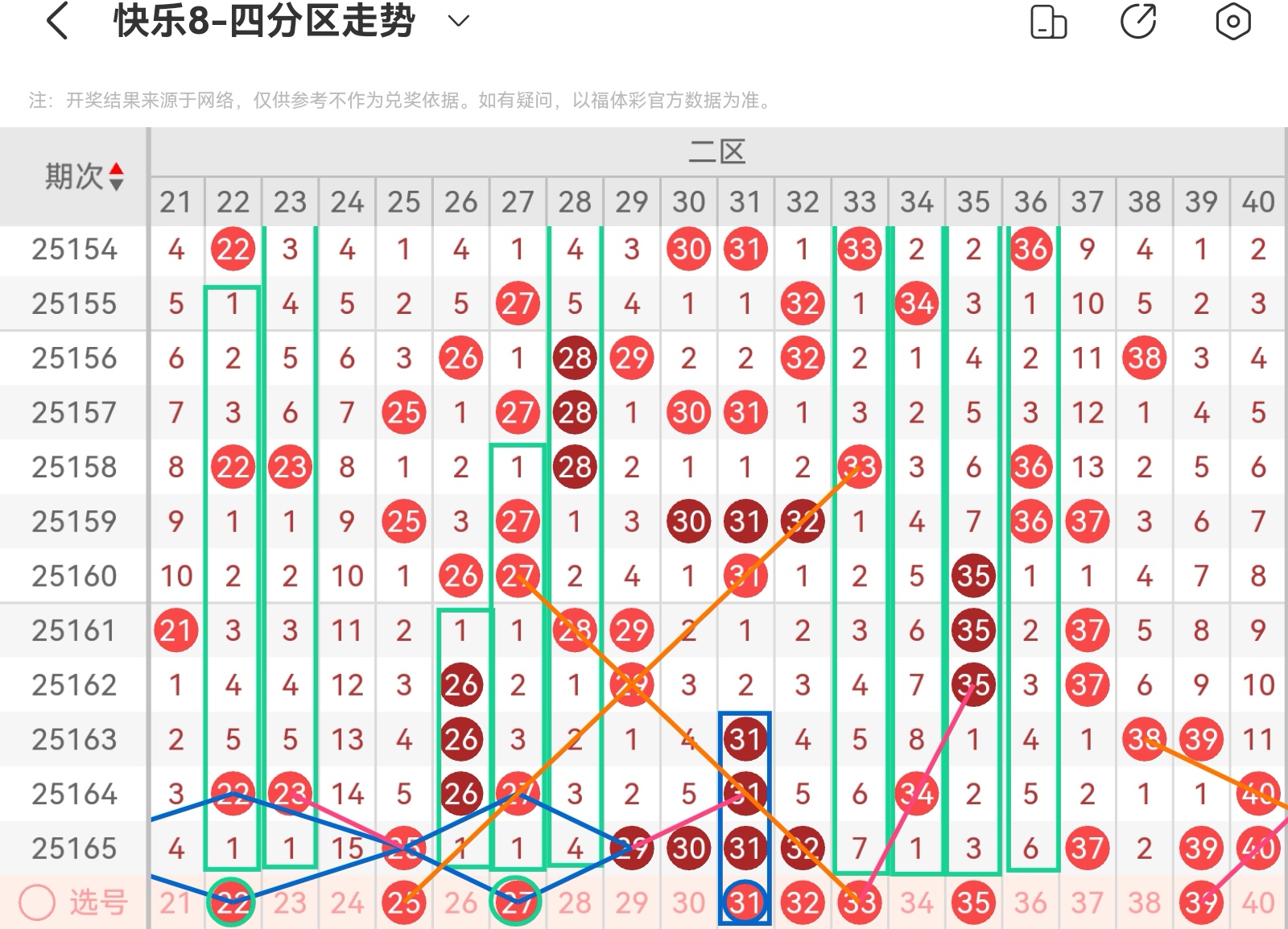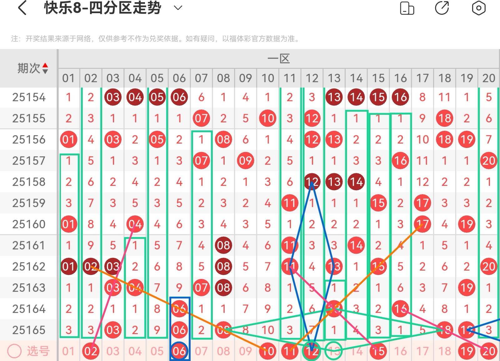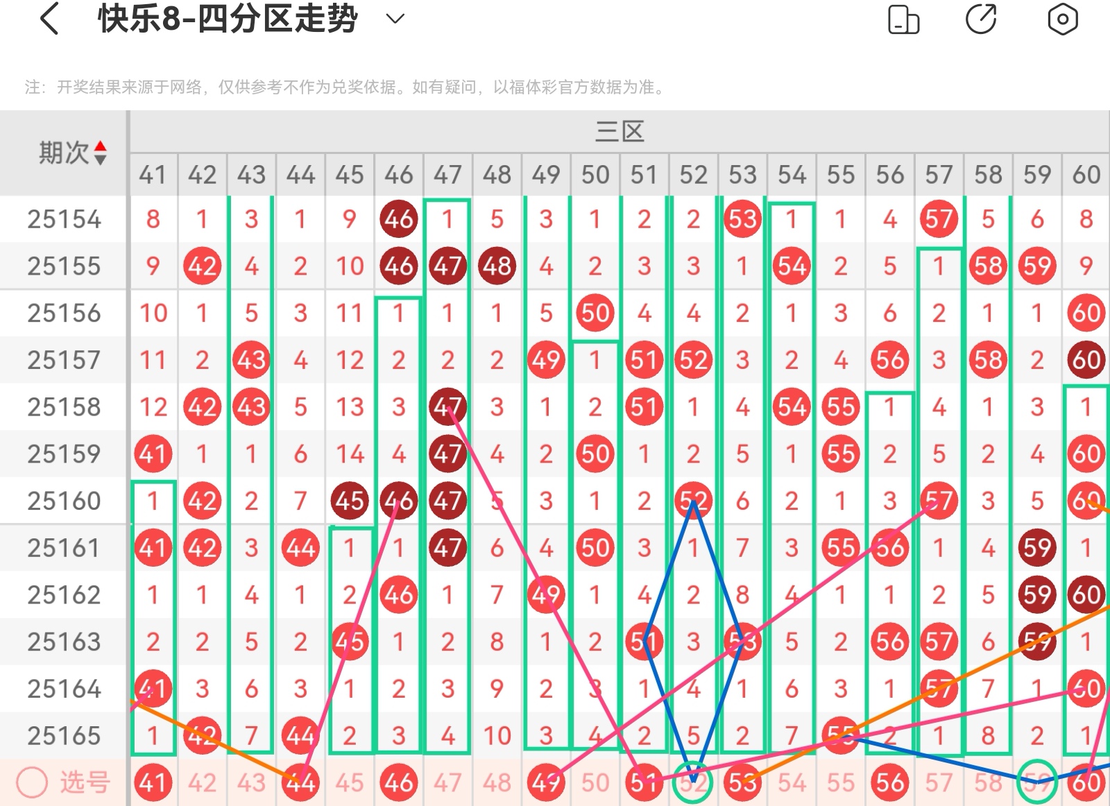 大家好,我是甜丝丝的坏事,主要以快乐八的形态走势、空位走势、遗漏走势以及斜连走势相结合的方法,用公认的四分区走势来进行预测分析,希望能让你有所收获。