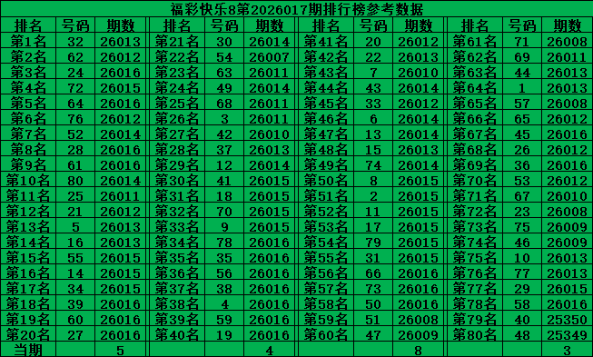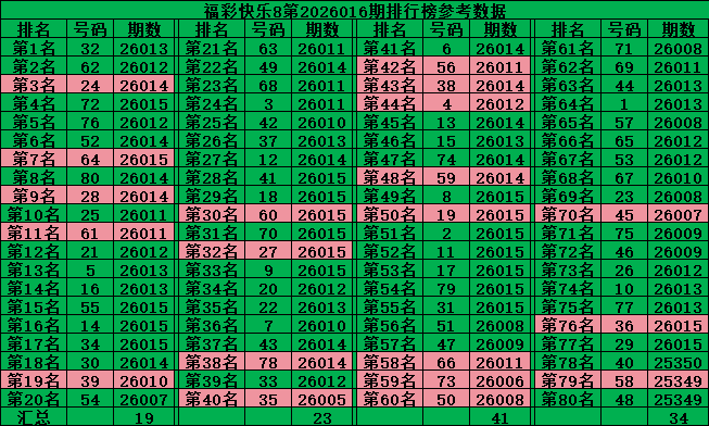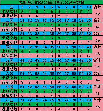 最后再把号码分为四区:一区01-20号、二区21-40号、三区41-60号、四区61-80号,理论上每个区每期应该开出5个号码: