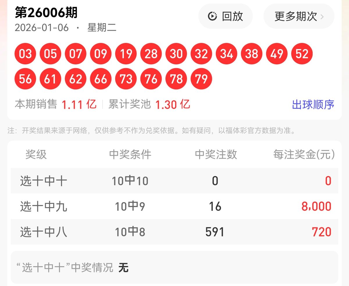 上期福彩快乐8第 2026006期开奖号码为【03 05 07 09 19 28 30 32 34 38 49 52 56 61 62 66 73 76 78 79】,其中大小比10:10,奇偶比为9:11,和值为857,跨度76,四区间比为5:5:3:7。下面是对本期对于每个号码的详细分析。
