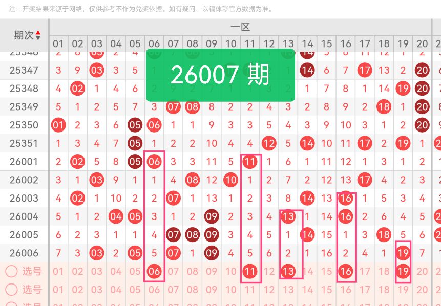 上期第一区间开奖5个号码,本期可能会稳定开出。从走势来看,1路号码在上期表现突出,本期继续保留13、16、19这类近期活跃度较高的号码,延续热势惯性。06作为0路号码,能平衡区间内路数分布,填补上期0路号码在该区间的分布空白。11属于2路号码,可完善区间内奇偶配比,与其他号码形成2:3的奇偶平衡。