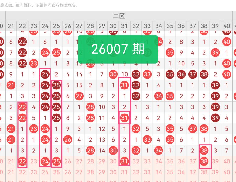 上期第二区间开奖5个号码,本期可能会稳定开出。本期推荐号码注重区间全覆盖,22与24作为邻号组合连号高频出现,同时二者分属1路和0路,路数分布合理。25作为区间中段的均衡号码,能衔接前后号码走势,提升组合连贯性。31和38分别填补区间后段的1路和2路空白,其中38在上期有出号,具备走势延续性。