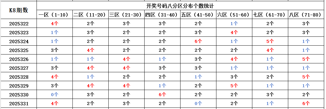 首先看上期回顾,“快乐8”第25331期开奖结果:5.6.7.8.14.18.22.23.25.31.40.52.59.63.71.72.73.76.77.79;通过分析开奖号码,分享第一个数据分析:统计开奖号码的八分区冷热走势,判断出号规律。以近10期开奖号码的八分区统计数据为例: