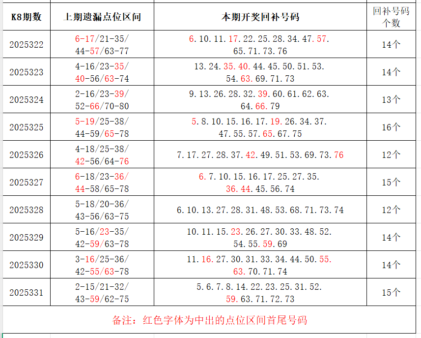 分享第二个数据分析:定位点位区间。上期开奖号码和邻号以外的号码,即为遗漏号码,大概率会在下期回补开出。以近10期回补点位区间的统计数据为例: