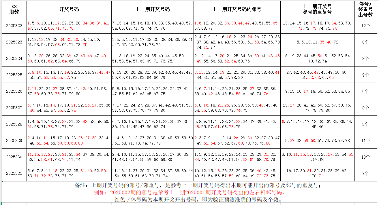 如图,红色字体是上期邻号、邻重号在下期开出,每期开出10个左右。上期邻号开出5个,邻重号开出2个。本期参考邻号:4.9.13.15.17.19.21.26.30.32.39.41.51.53.58.60.62.64.70.74.75.80;邻重号:5.6.7.8.22.23.24.71.72.73.76.77.78;个人分析,仅供参考。