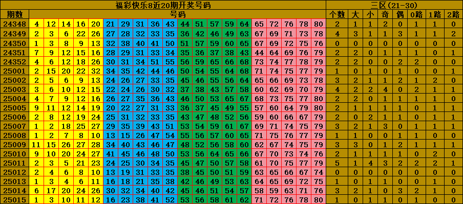 先看下近20期的开奖情况,判断新的一期各区出号个数和类型:
