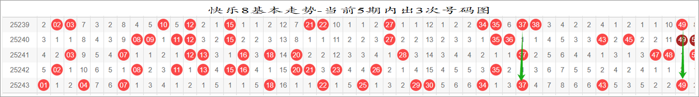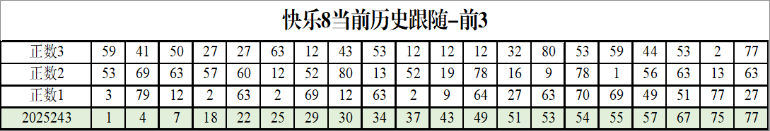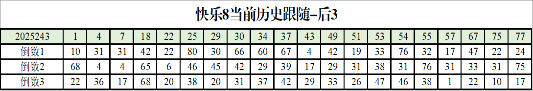 我感觉选热的同时,还要注意防冷条件开出,可以直接选取每个号码跟随出次前三的号码,也可以考虑把出次最后的三个数字加进去,不过这样可能号码太多,可以尝试。图上也能看出单独号码跟随的情况,我就不一一统计每个号码的出次了,我这里考虑提高概率,取每个号码历史跟随的前三号码和后三号码,根据2025243期的号码,我关注正数3和倒数3的号码号码为: