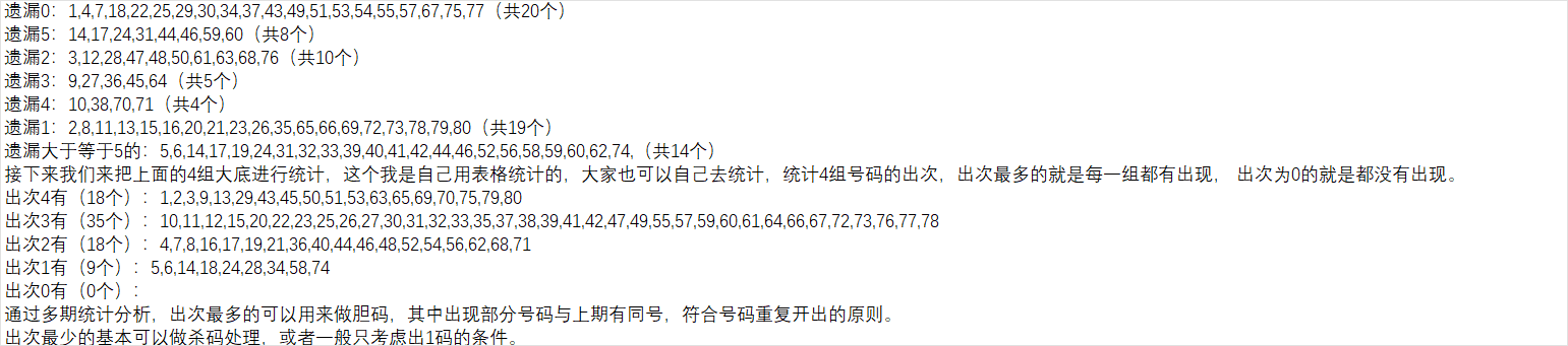 从上图看出,还是值得我们参考,经过统计精选了这些号码作为精选大底(2,3,7,8,11,12,13,15,16,18,20,21,22,34,35,37,43,49,50,51,53,55,61,65,66,68,69,72,75,76,78,79,80,),共33个,上期这个条件有29个,开出4个,所以可以用来作为我们进一步组号的一个条件。