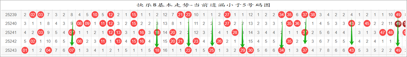 所以这个条件值得关注,从号码分布图上我们可以分析出,遗漏小于5期的号码有: