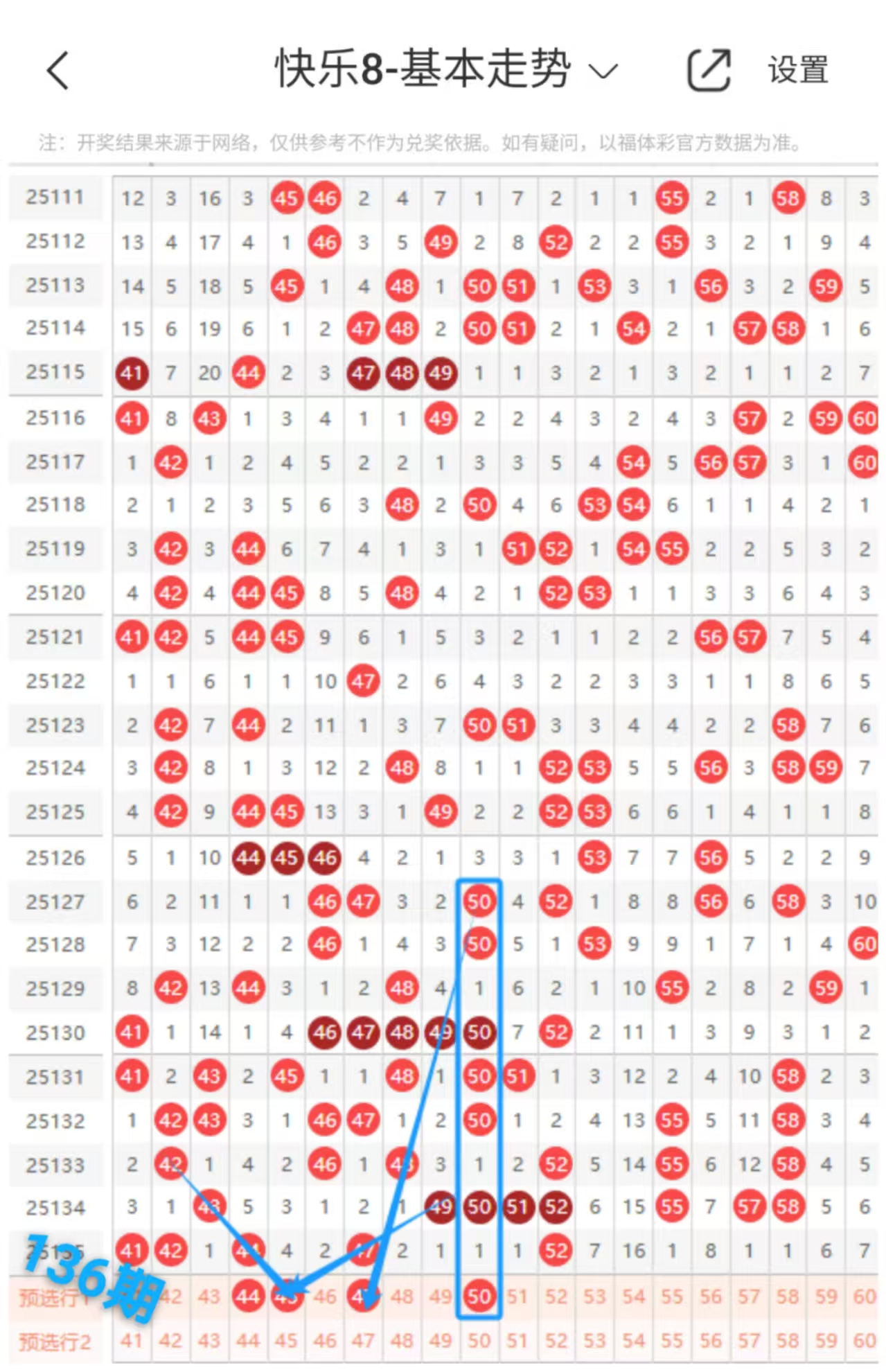 50号:这个号码本期是自身跳格对称下落的走势形态的,本期重点关注的。