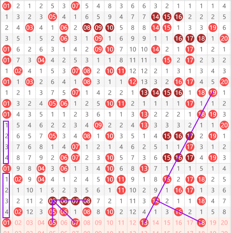 快乐8第2025333期01-20区域,这个区域推荐的第一个号码是01号,大家看到他有一个间隔4的对称关系,然后下来是05号,有三重的可能性,由于上面是一个四连码,所以05有极大的可能性三重;07我们看到他拉下来以后个05.06.07的走势是符合四横连往回斜拉的一个走势。然后13号我们看到是一个大的间隔一斜连;而十八号是一个间隔一斜连。具体的请根据个人思路进行选择