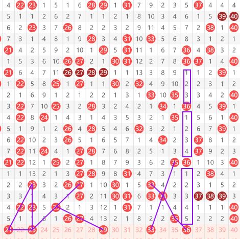 快乐8第2025333期20~40区域,这个区域推荐的号码大家看,首先是21号23,我们可以看到是一个三角的走势,23还具备一个27,间隔一开出25,再间隔一开出23的三斜连走势。然后29号也是一个三斜连。下来就是33号的一个斜连号码,以及36号的一个对称走势,以及它的间隔递增走势。具体的大家根据自己的思路选择。