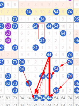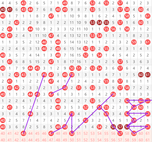 快乐8第2025333期41-60区域的推荐如上图,这个区域推荐的第一个号码是43号,一个大的斜连号码,然后就是47号,我们看到50间隔1带49,然后再间隔1带47的一个走势,属于形态复刻。下面就是50号的一个大斜连,还有57号三重码下中间的一个走势,再一个就是59号,大家看到他和58和61之间的关系。具体请根据个人思路选择。