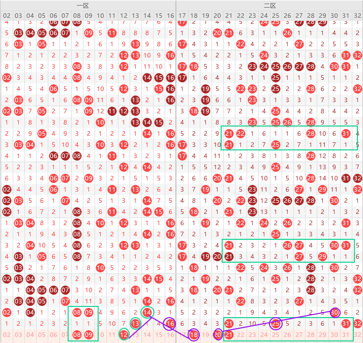 二区胆尾0尾5尾 2尾,边号20 22 24 26 30出一码,重号21 25 31 32出一码,形态上18 20是斜连号,上图已勾画,重号断3期,本期重号极大概率回补,重号21 25二出一,21是大明号跟上面一模一样,已勾画,近期连号下面不走重,可以看走势图,那么本期31 32很小概率出号,可以防31,遗漏值18 20 28三出一,本期极大概率有同尾号结论关注五码19 20 21 25 26防29