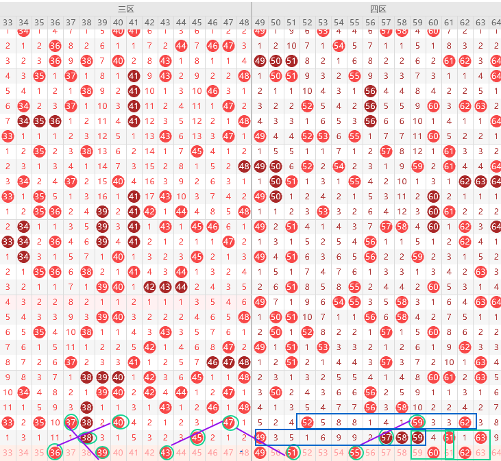 三区胆尾9尾 2尾,边号37 39 44 46出一码,重号38 45出一码,形态上36 39 43是斜连号,上图已勾画,8尾出3期,本期如果38不走重,看48,遗漏值34 39 42 44四出一,结论关注五码34 39 42 45 48