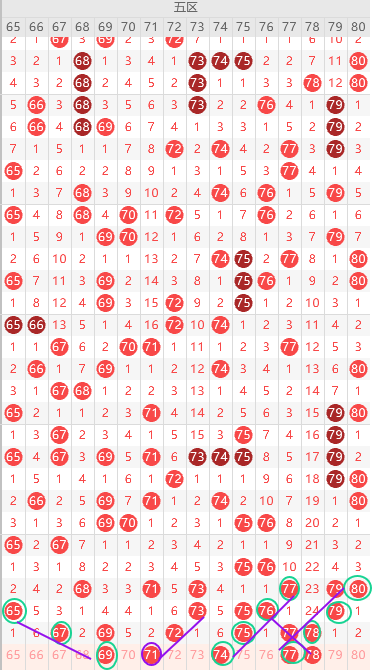 五区胆尾7尾6尾,边号68 70 71 73 74 76 79出一码,重号67 69 72 75 77 78出一码,形态上69 71 74 77 78是斜连号,上图已勾画,遗漏值65 73 76 79出一码,短期规律连号下面走重,跟趋势走,那么本期77 78出一码优先78,其重号防72,9尾出三期,69不好出中,可以看79,算周期本期有0尾,70 80二出一,结论关注五码70 72 76 78 79防80