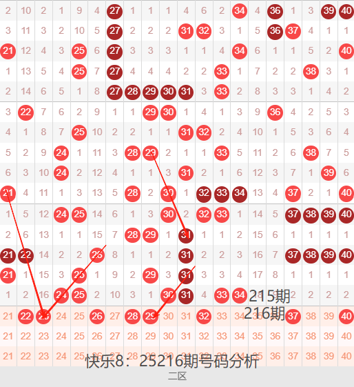 二区间21-40号码球走势,如下图: