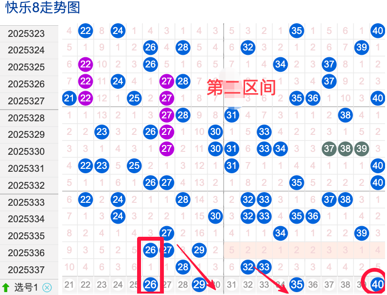上期二区开出3个奖号(28.32.33)上期回顾二区开出3个奖号二区间在上期落位同比前期的话呈现了一个不变的落位趋势,先来看本期号码26整体活跃度较热,在近 30 期里有一定的间歇性出现,不是每期都开,近期整体走势稍微稳定。号码29近期热度较冷,间隔性也不是很好,说明其在当前阶段活跃度较冷注意防守。号码35近期活跃度较热,有一定的间歇性近期整体走势相对平稳没有特别明显的冷热趋势变化,号码40近30期内活跃度较热,没有明显的连续出现形态走势,整体表现比较动荡还是很稳定。