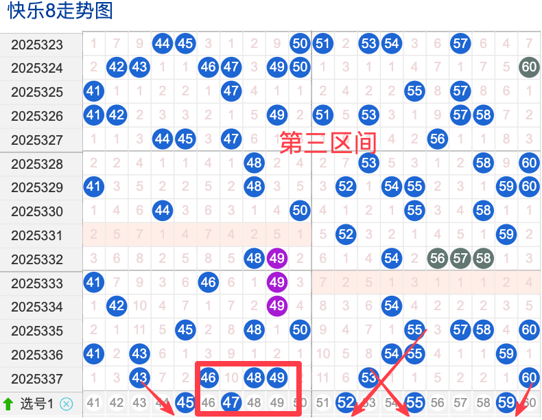 三区间开出了6个奖号(43.46.48.49.53.60)上期回顾三区开出6个奖号上期的三区间的奖号数量呈现一个递增的形态,4头回补4个,本期先来看号码45近期出现频率相对来说还是很稳定。偶尔有时间隔期数也是很长,说明其在近期的开奖中较热的,号码48在近 30 期内出现次数相对还是稳定的号码,近期的活跃度也是较热。号码52有一定的间歇性,通常间隔5-3期会出现一次,没有明显的连续出现态势,走势相对较稳定,在整个第三区间的表现本期还是可以防守的。号码55走势相对近期较热,近期没有连续间隔落号的情况,活跃度近期处于较热状态注意防守。