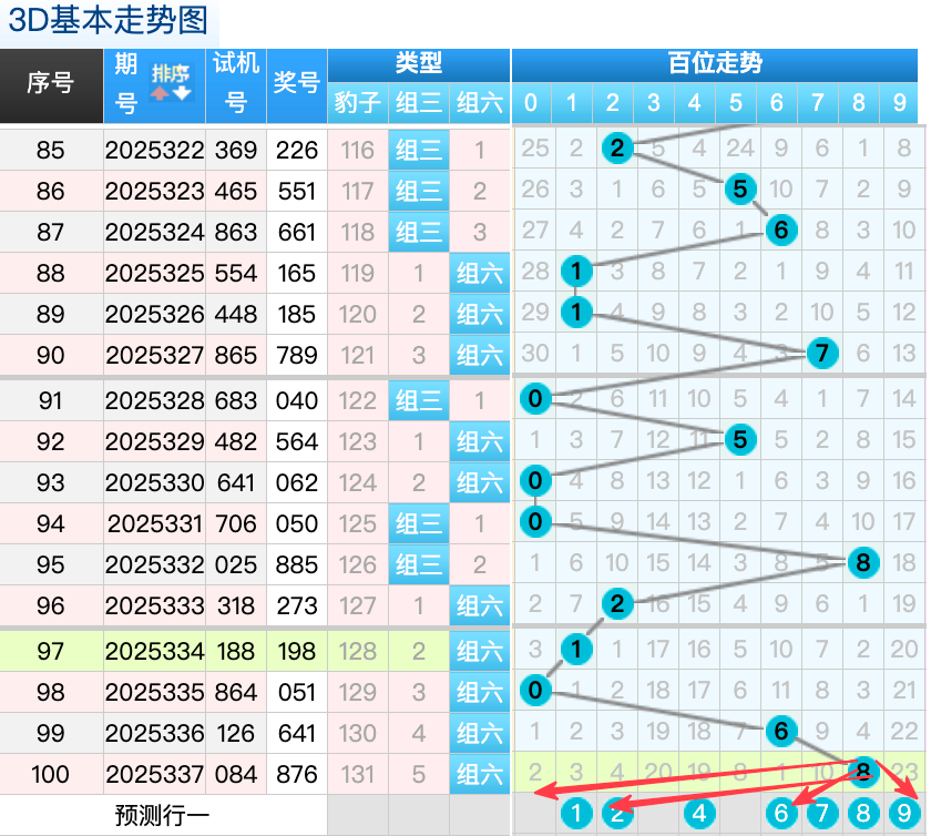 3D上期百位开出的8号球,这个奖号是一个冷码的回补落位趋势也是一个比较好的符合百位上的落位点,先来看8号球这里还是有机会继续走出一个重码的趋势也是一个小周期的回补号码,还有一个就是2号球和1号球这里的号码落位形态的概率在这里的机会还是很好的要注意防守,然后9号球这里要注意也是一个大号的间隔23期回补码落位趋势要注意防守,6号球在百位上要注意可能有机会走出折返回补的落位注意防守 。