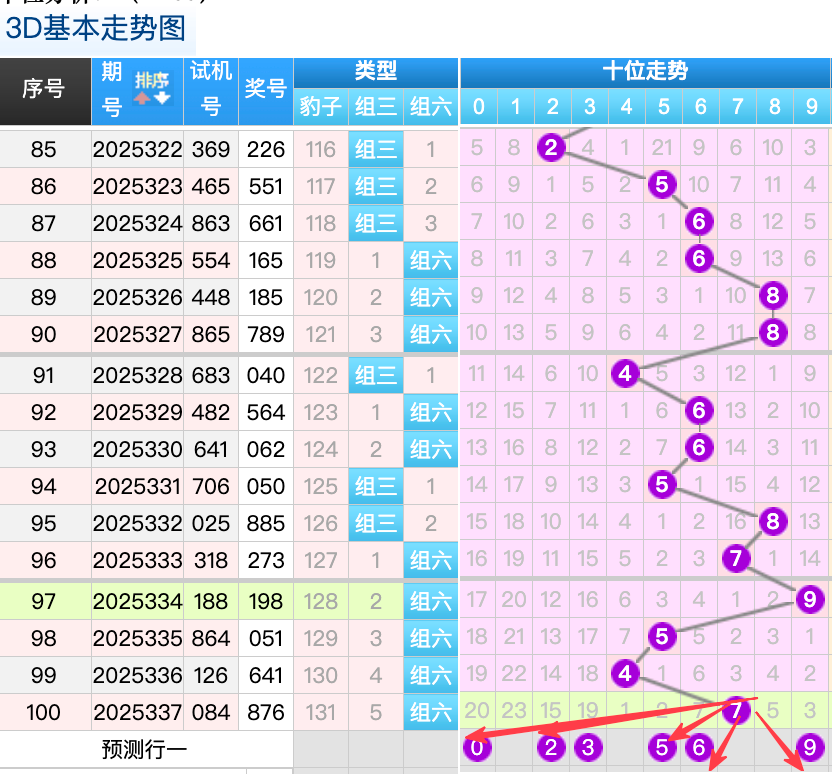 上期3D十位开出的奖号是7号,上期在十位上7号球这个号码在上期是一个冷回补的落位点,本期来看5号和6号球在十位上要注意这两个号码是有机会继续顺着上期的7号球继续走出两个常搭配落位趋势这里的两码注意防守一码就好了,然后4号球还是一个号码这里也是一个折返码落位点,再来看2号球是冷码的回补这个点位参考就好,9号球这里的号码要防守能走出顺位的落位趋势。
