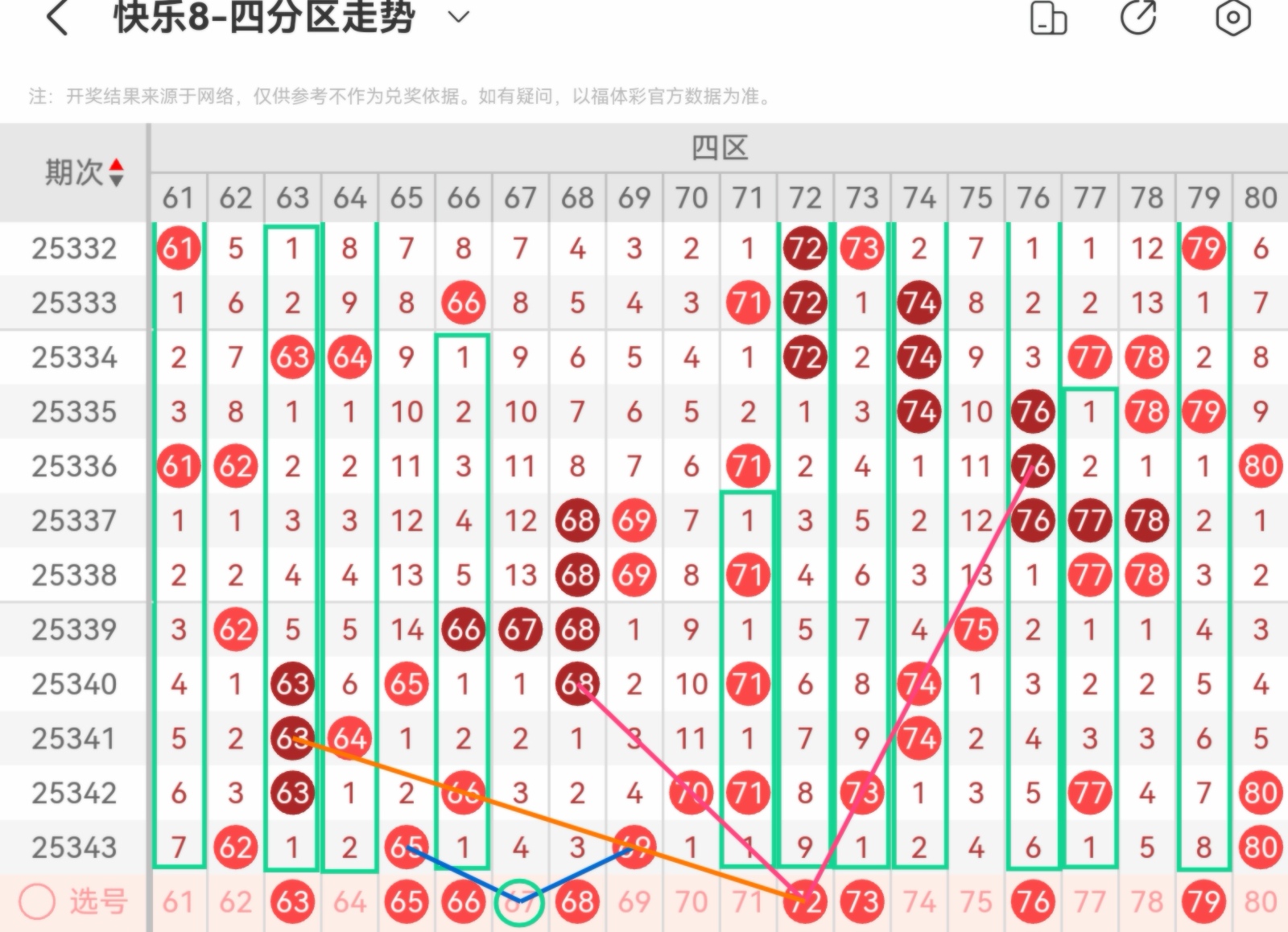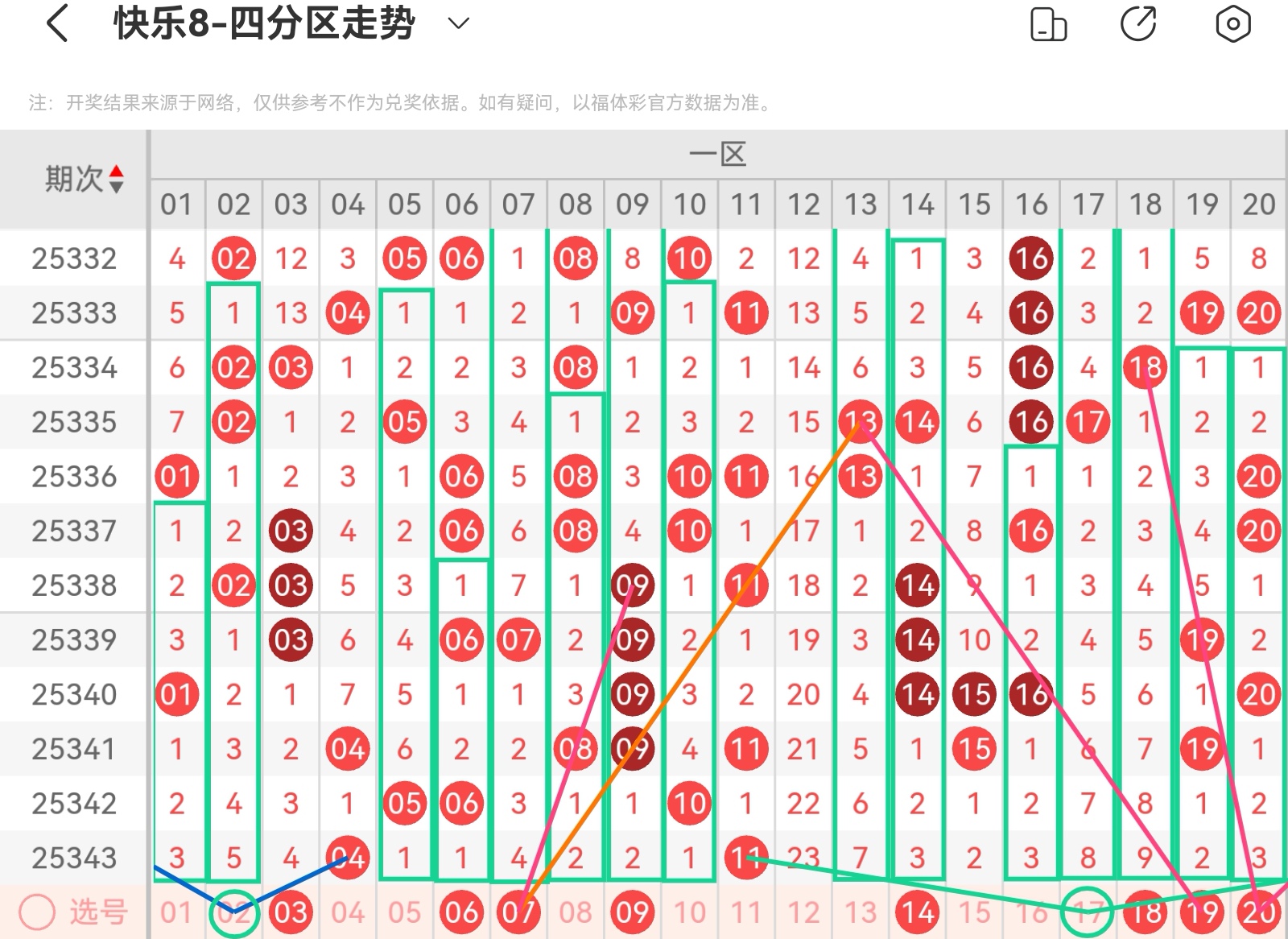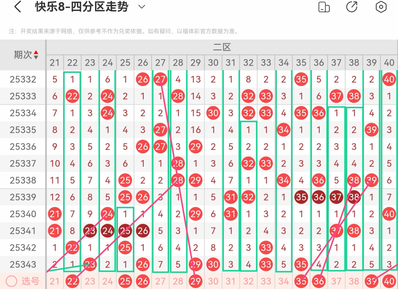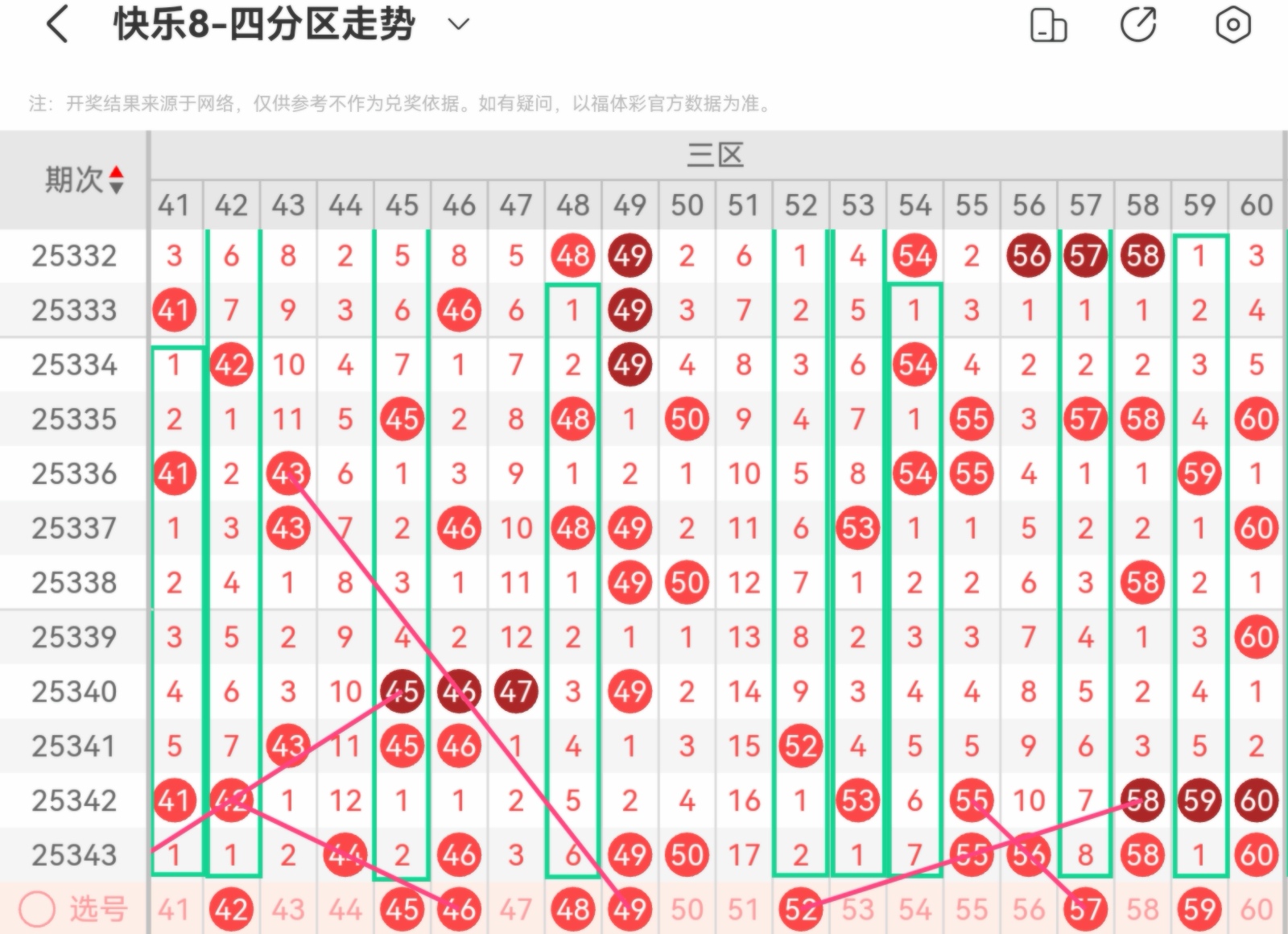 大家好,我是甜丝丝的坏事,主要以快乐八的形态走势、空位走势、遗漏走势以及斜连走势相结合的方法,用公认的四分区走势来进行预测分析,希望能让你有所收获。
