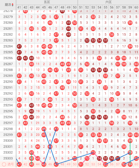 六区开出:52 54 55 56 57 60 奇偶比: 2:4 和值:334 跨度:8,上期开出6个号码,偶数号码占优势。本期三斜连走势:51,隔码斜连走势:55 58。近10期平均出号2.8枚,本期推荐关注号码:51、55、58、59。
