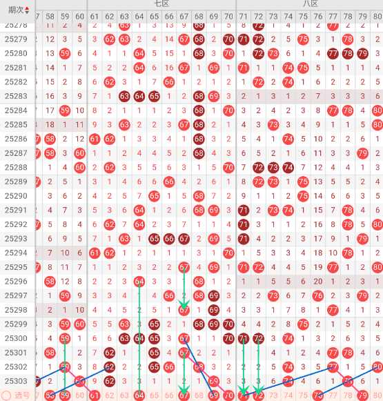 八区开出:74 78 奇偶比: 0:2 和值:152 跨度:4,上期开出2个号码,偶数号码占优势。本期无三斜连走势,隔码斜连走势:71 76。近10期平均出号2枚,推荐关注号码:71、72、76、79。