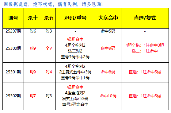 直选命中5码,大底推荐命中10码,本期再接再厉。