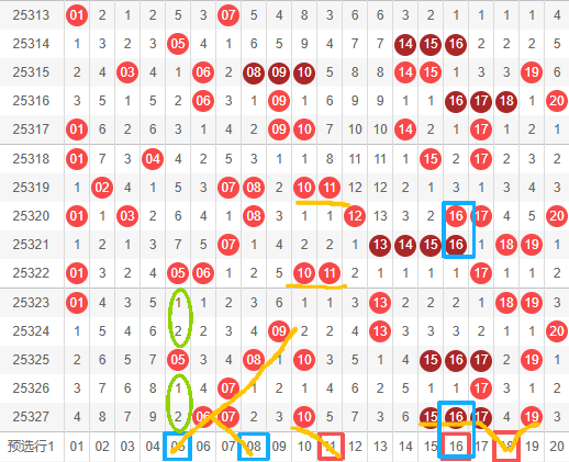 08: 本人认为08是在一区前区较热的号,15期内开出4次,一次两连重号,上次是与09左斜连下来,接着07下来,上期开出06.07双连号,本期看好双向走势,落05和08.