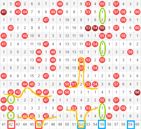 55: 55如图,间隔两期开一次,55是三区典型的热号,上期开邻号56,本期左斜连下来,落55。