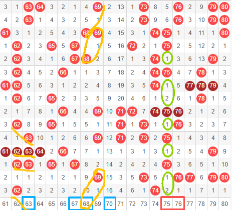 75+76: 75在近15期内开出6次,很热,不被注意的热号,基本间隔一期两期都会出的号,76是回旋号明显,本期推荐75+76开小连号。