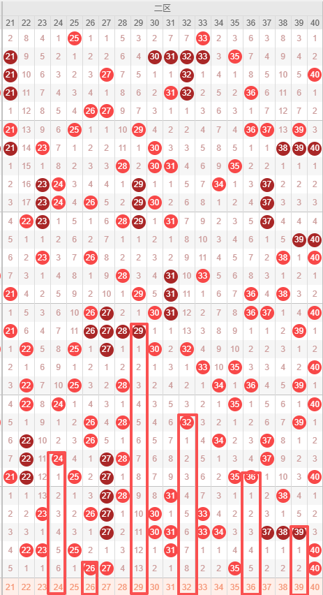 二区:最近二区10期出号情况为:4 4 4 5 7 4 5 8 5 4,总出号情况为50个,平均出号5个,本期二区号码还是比较弱势推荐:24 26 29 32 36 39。重点关注:24 26 29 32。