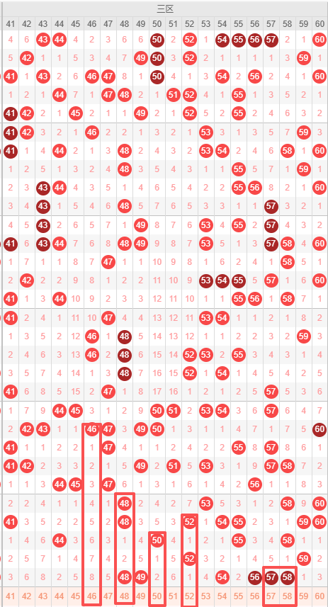 三区:最近三区10期出号情况为:7 7 4 7 4 4 7 4 2 6,总出号情况为52个,平均出号5.2个,本期三区号码走势比较不错推荐:46 48 50 52 57 58,重点关注:46 50 52。